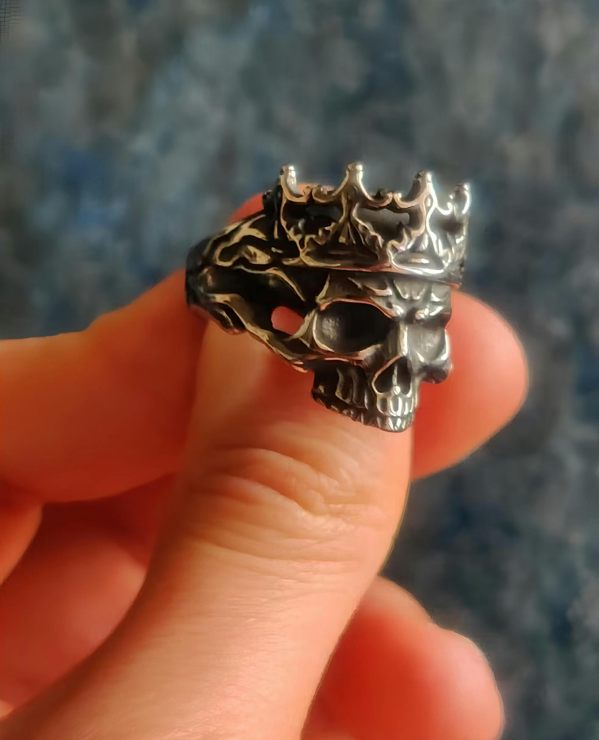 Rule the dark with the Monarch of The Dead Skull & Crown Ring. This design features a skull crowned with gothic flames, representing both power and eternal reign. The intricate carved details and antique dark finish give the ring a vintage aura, while the hollow inner band and slightly oversized fit ensure comfort even for thicker fingers.